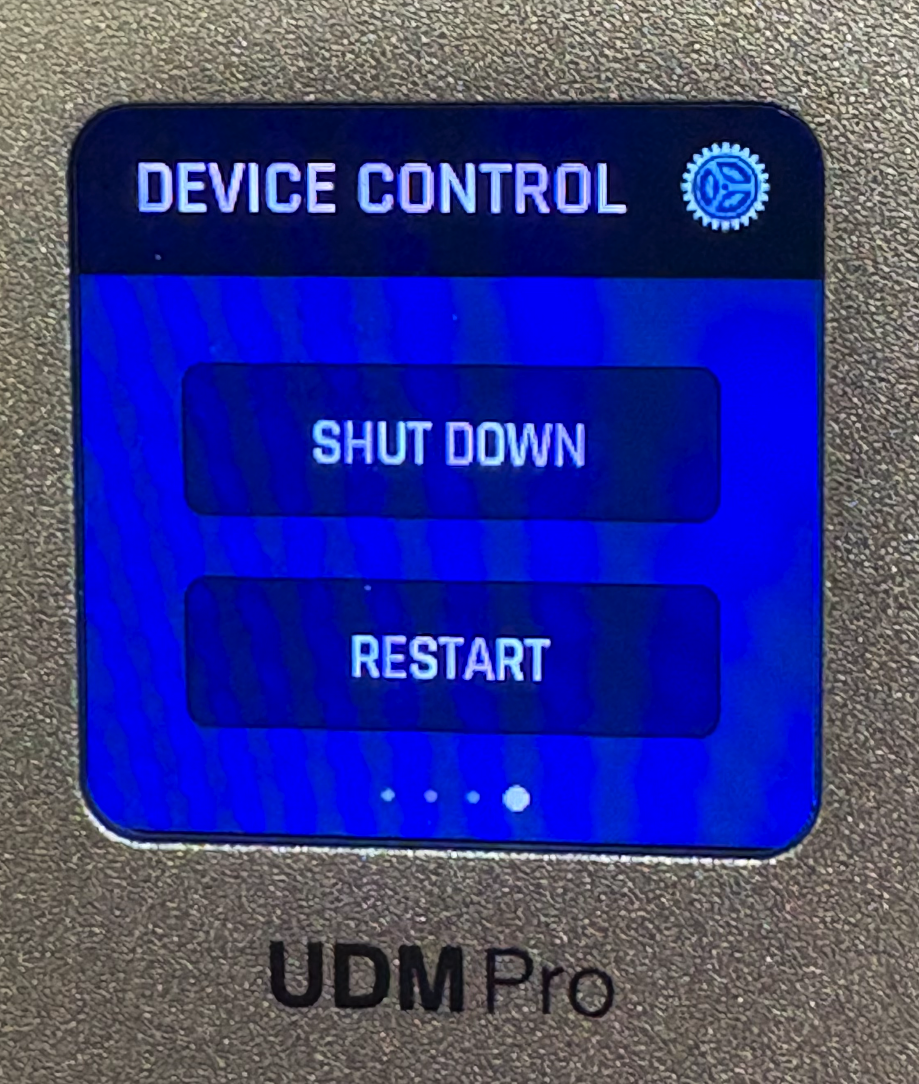 This guide will walk you through the steps to restart your school internet router (UDM) using its built-in display. Restarting your router can help resolve connectivity issues or internet outages. This should only be done at the direction of the IT team. Follow these simple steps to navigate the UDM’s display and perform a restart.